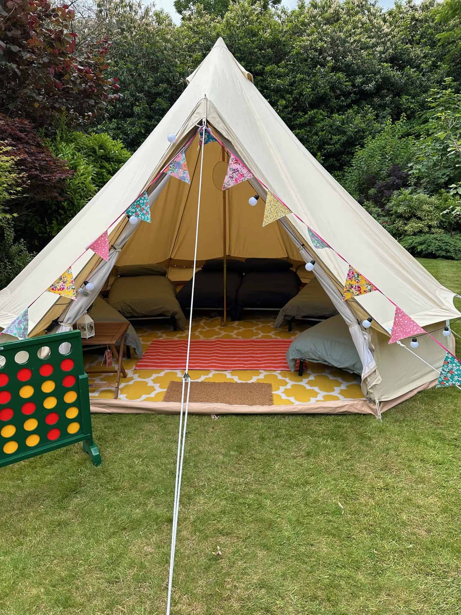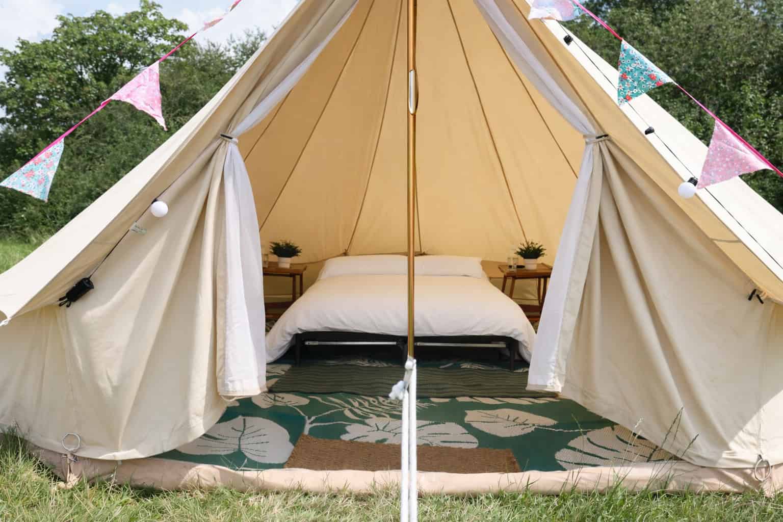 A 100% cotton canvas 5 metre bell tent with zipped in ground sheet. Bright full moon flooring, rug, warm ambient Lampsy light, faux plants, tea lights, candle holders, comfortable Jay-Be folding bed, wooden side table, fairy lights, and mirror.